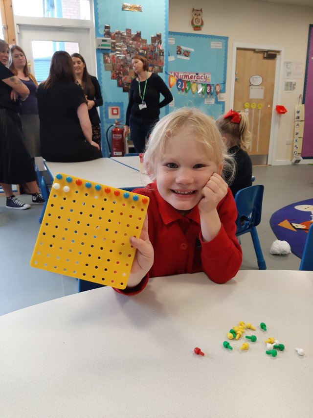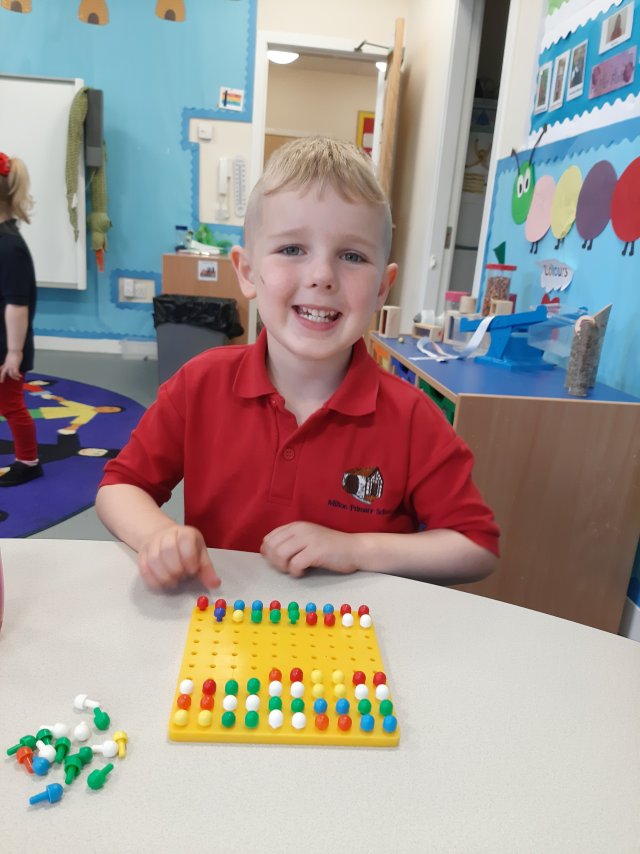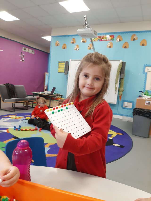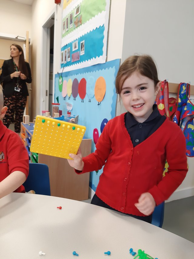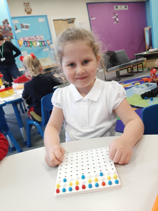 Today the boys and girls in Primary 1 (or the Seahorses as we have renamed ourselves!) were busy exploring pattern. The children had lots of fun using peg boards to explore making their own patterns as well as trying to copy some patterns that Miss Robinson made. The children all worked really well and Miss Robinson was really impressed by how much they all concentrated on the task.