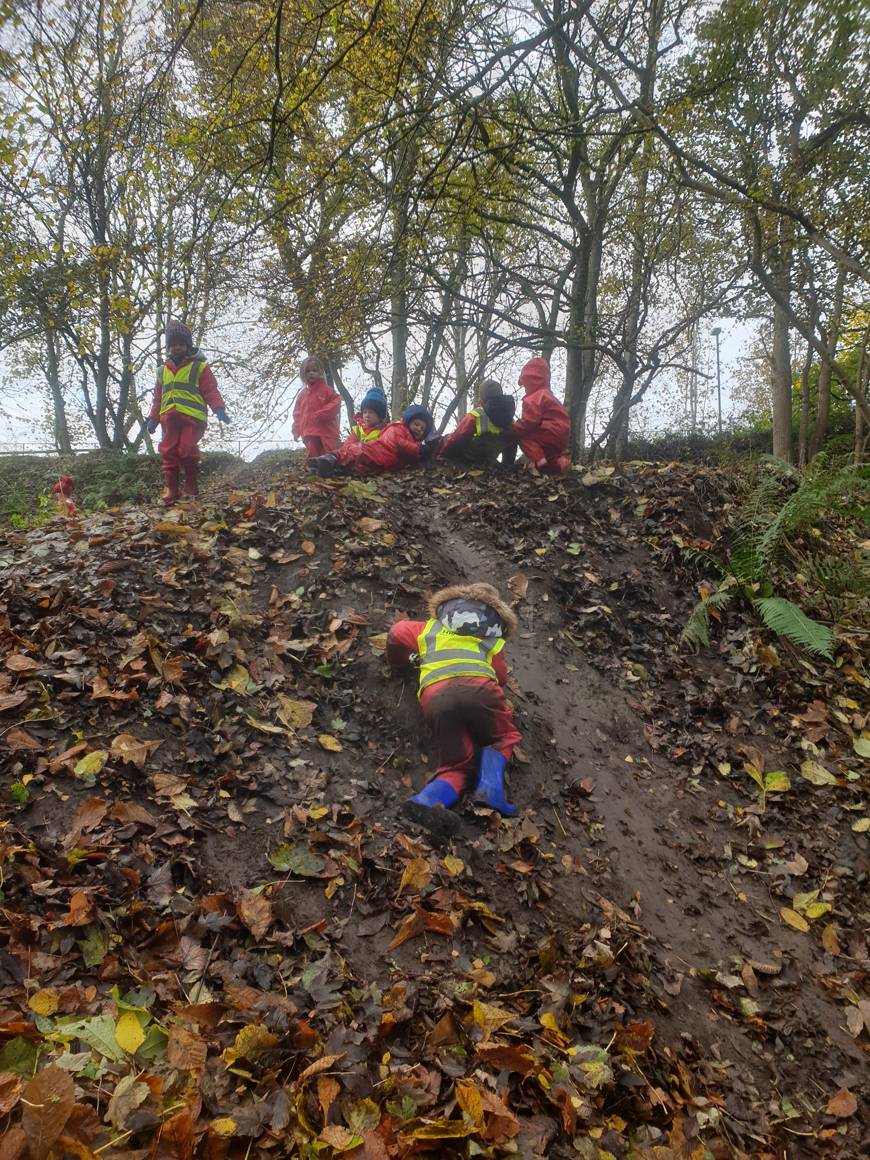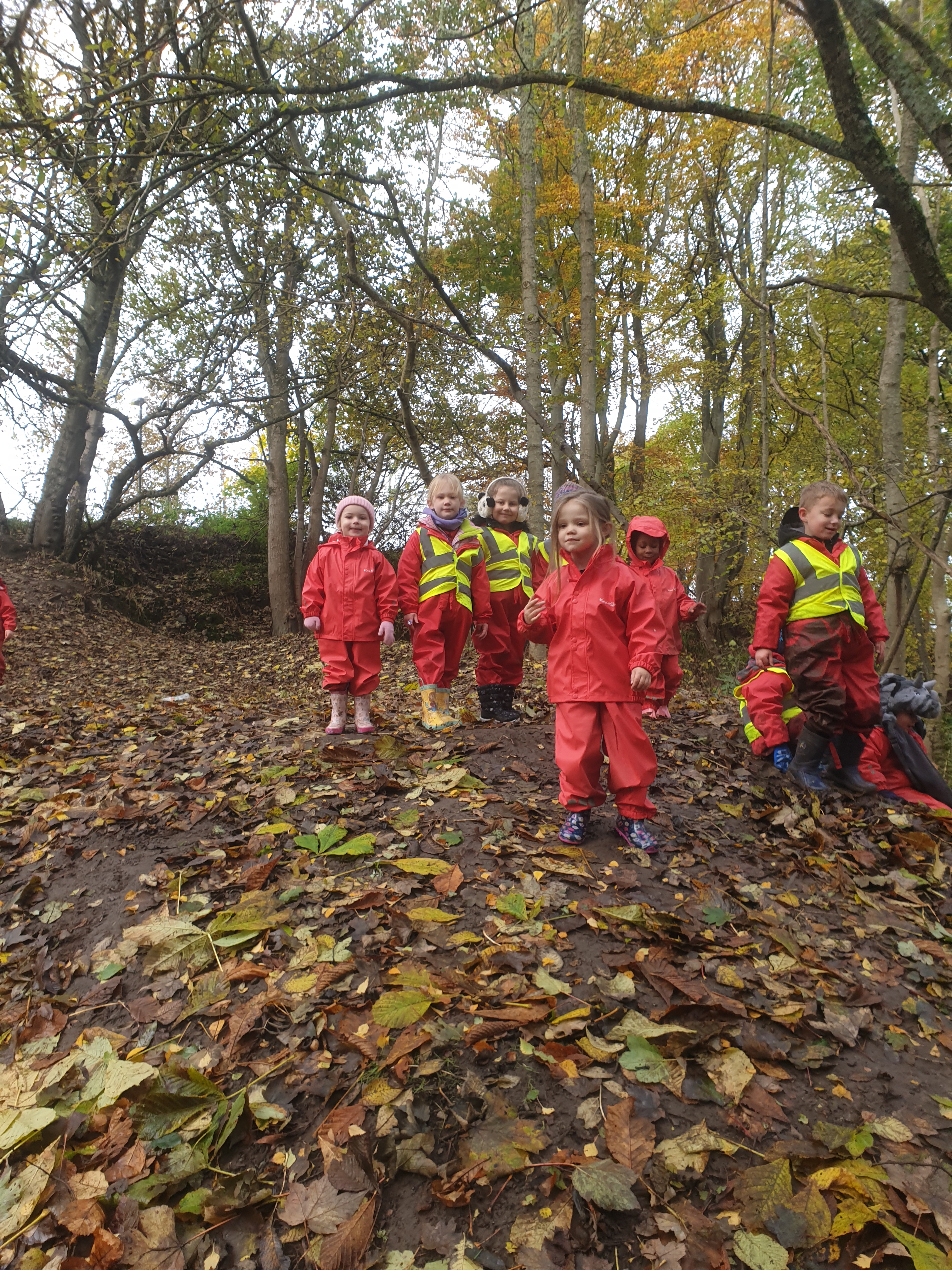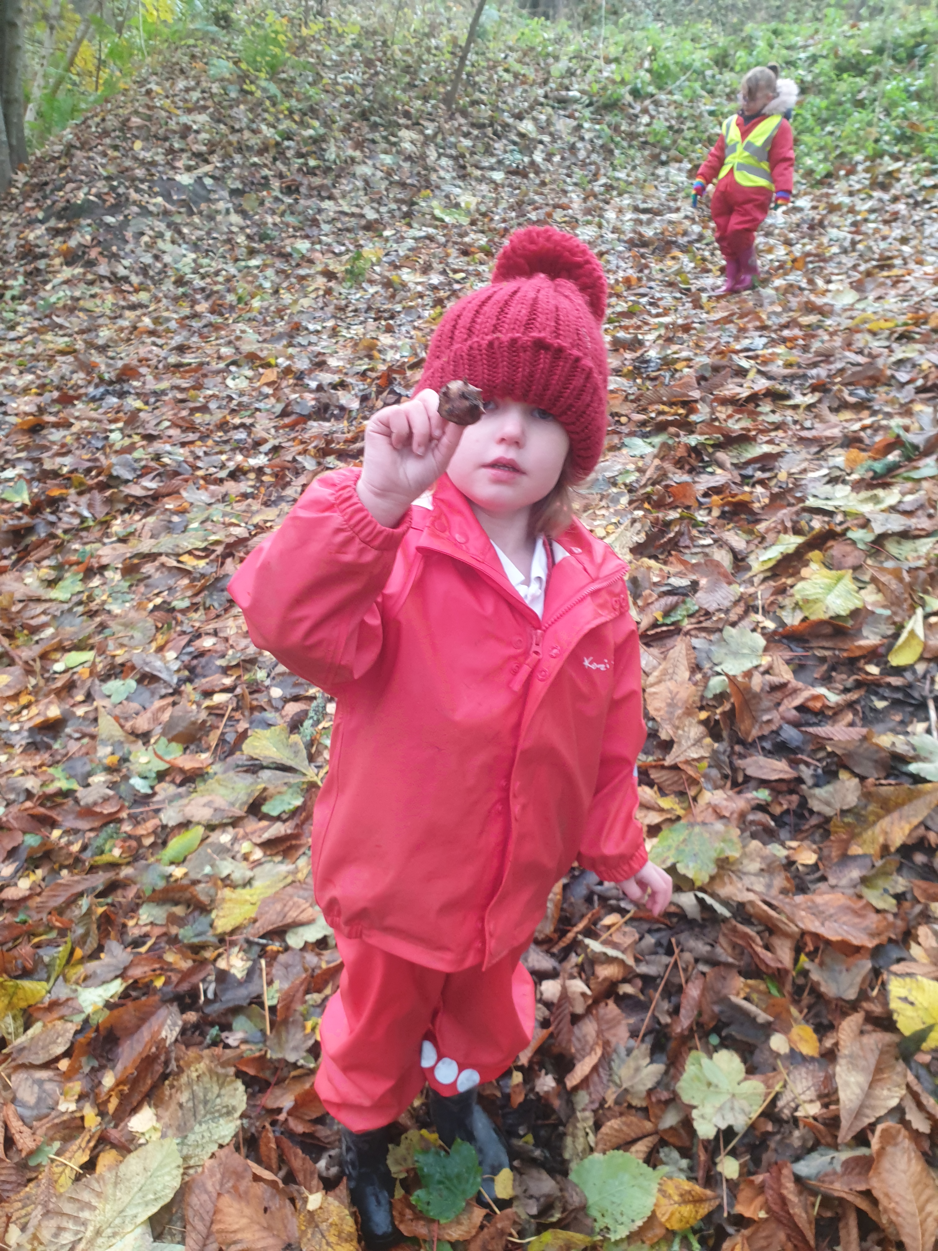 We found the perfect spot with lots of fallen leaves to hunt for conkers in. There was lots of talk about the different colours in the woods and why so many leaves were lying on the ground.