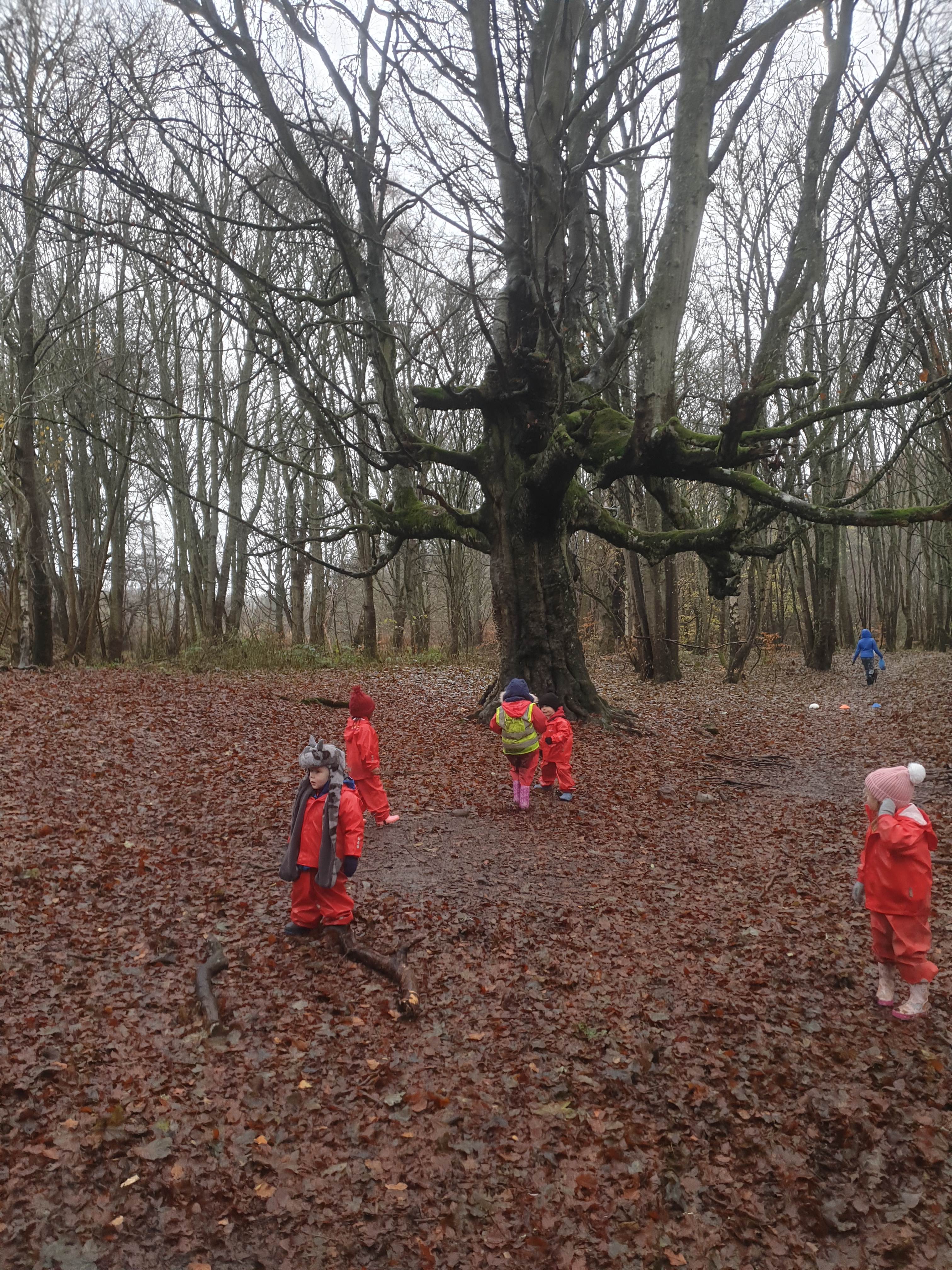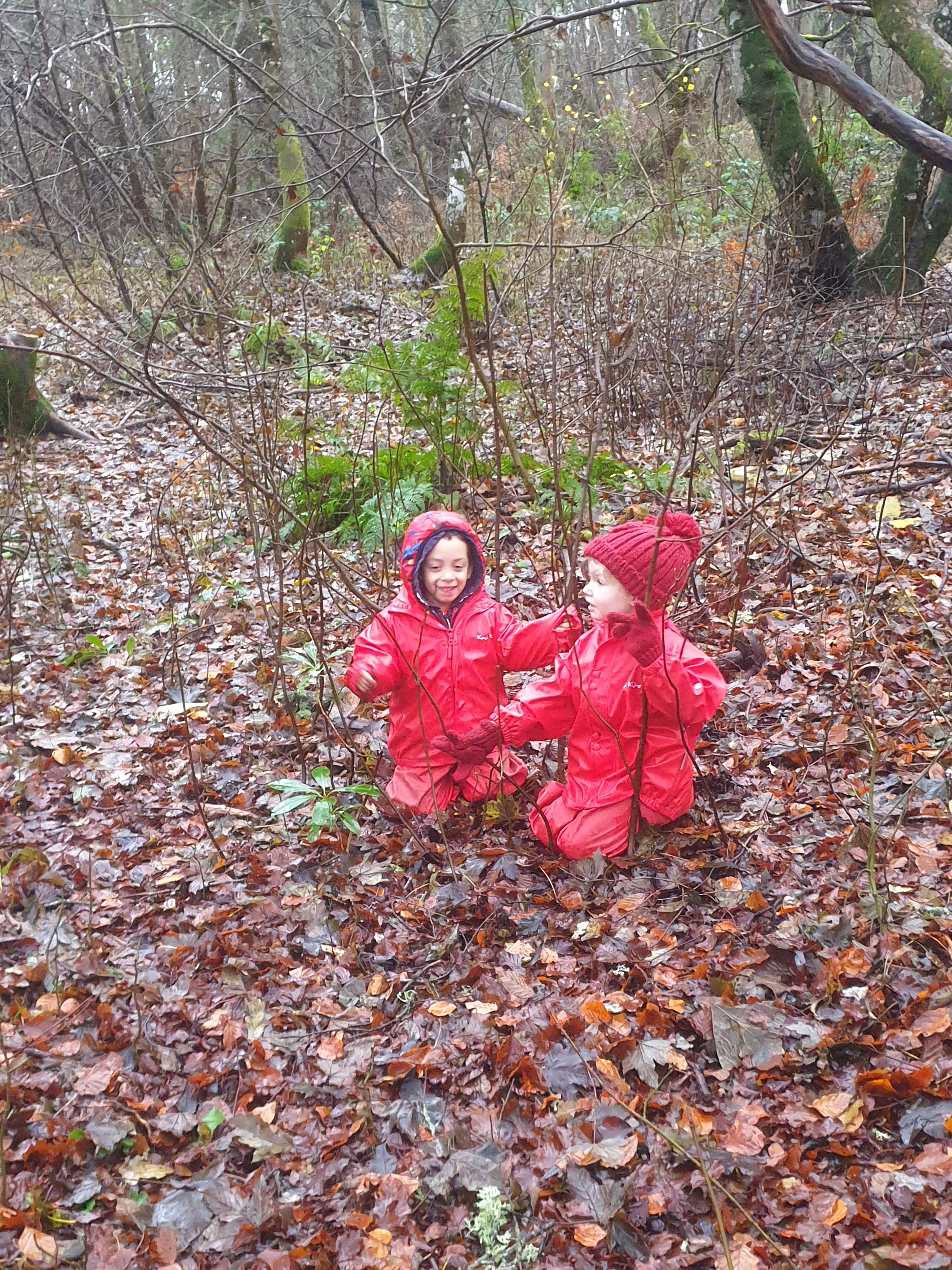 The rain did not put us off the woods today. We all put on our red suits and wellies then headed out.