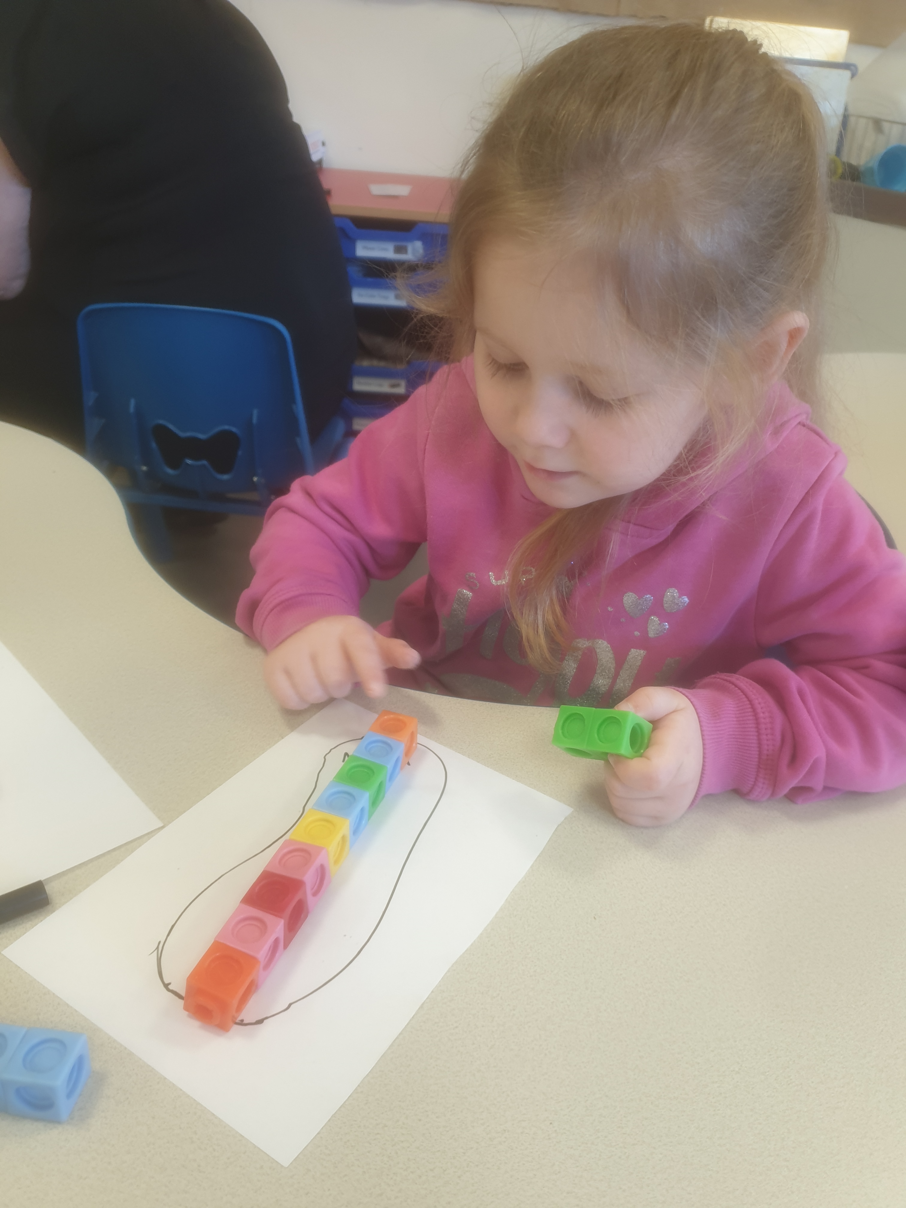 The children with a little help drew round their shoes then measured them with cubes. We found out that Harris’ shoe is 7 bricks long and is the smallest shoe in the class! Could this be a clue as to where his shoe disappears too? We need to do more investigating.