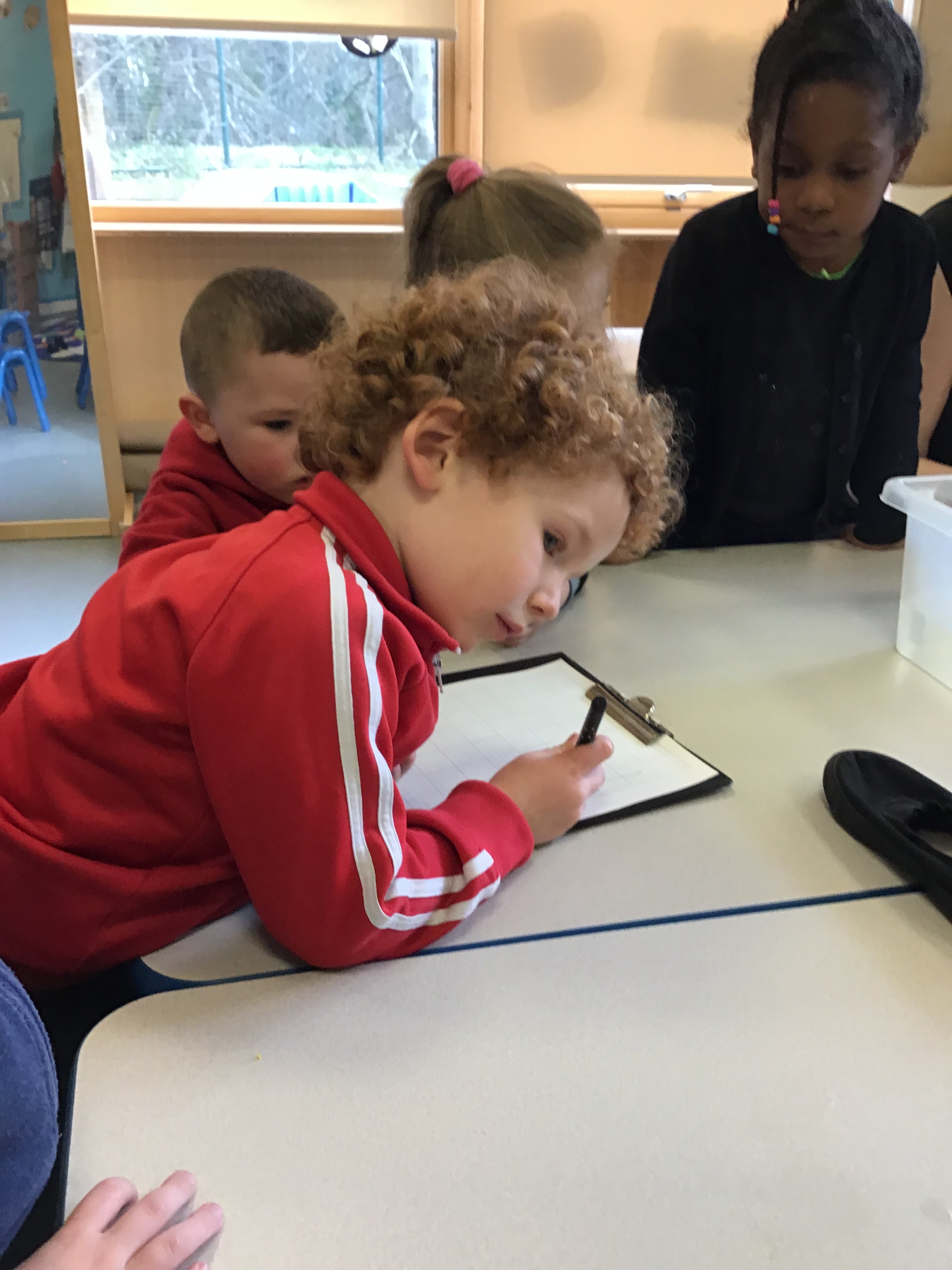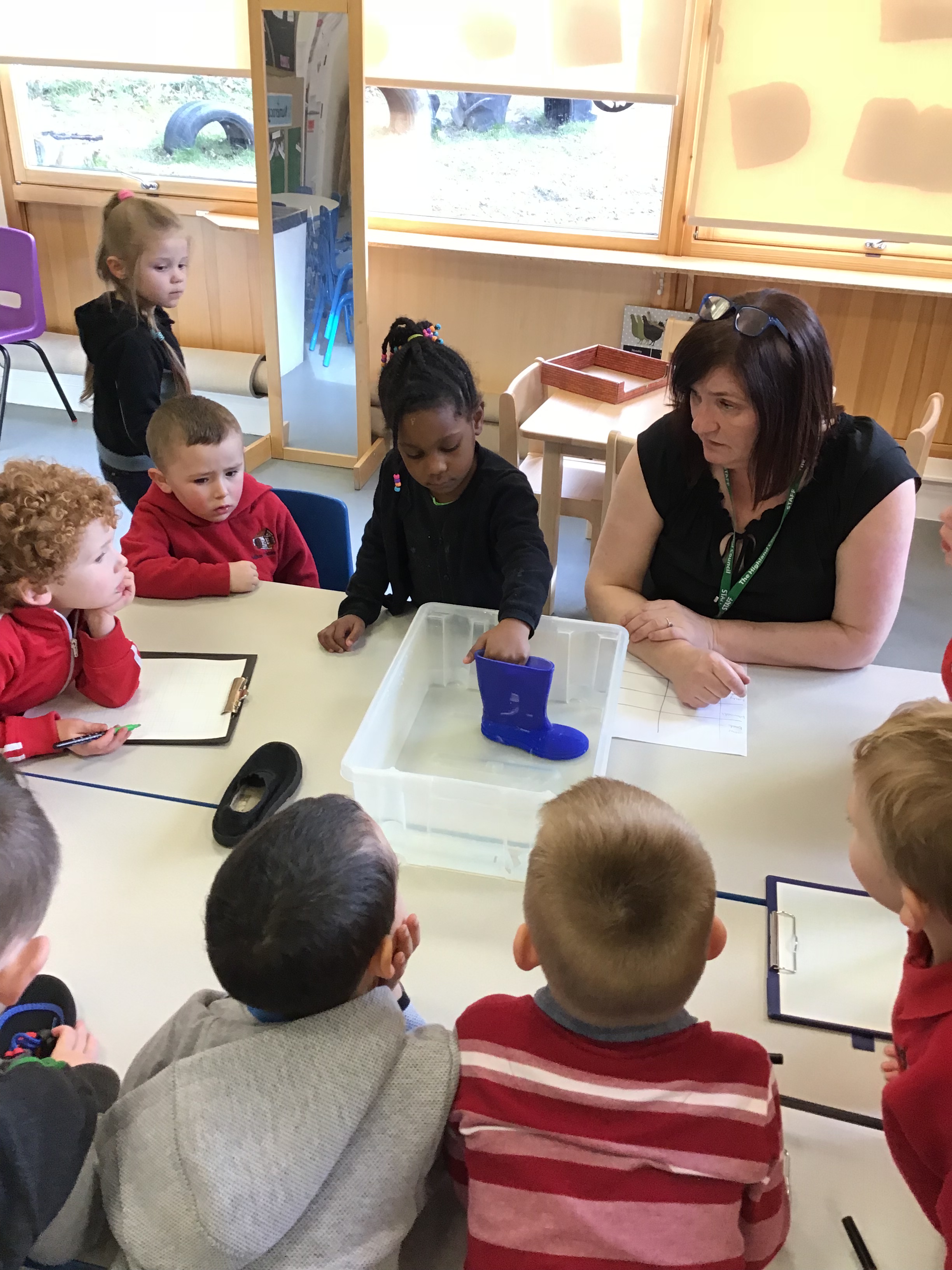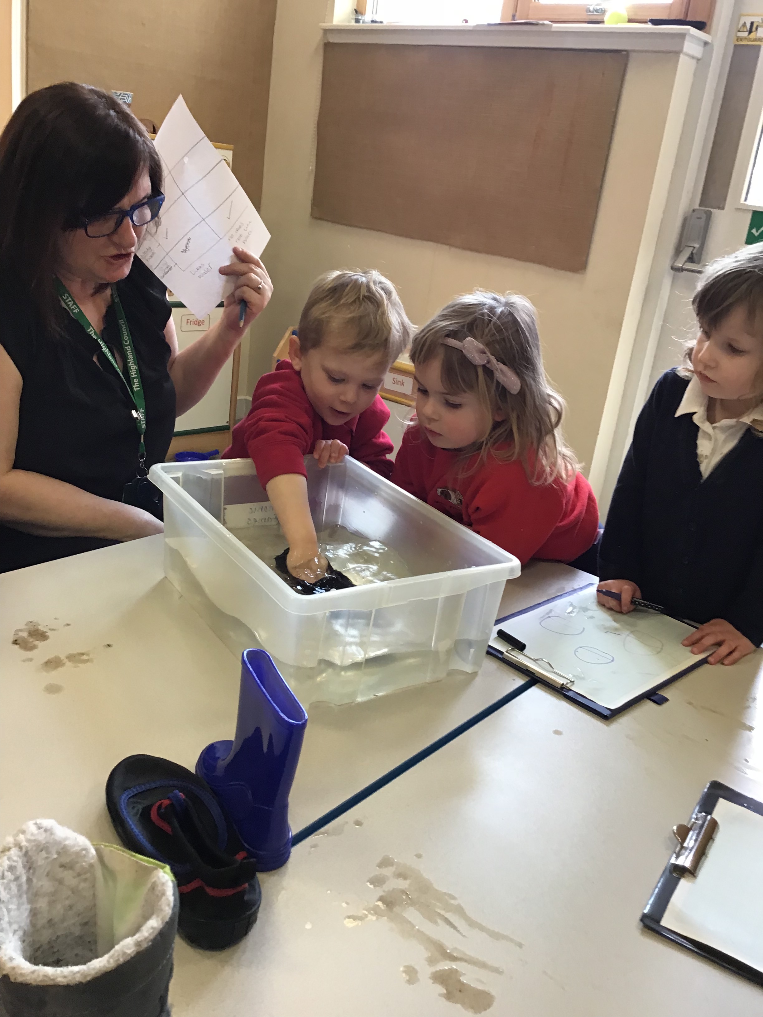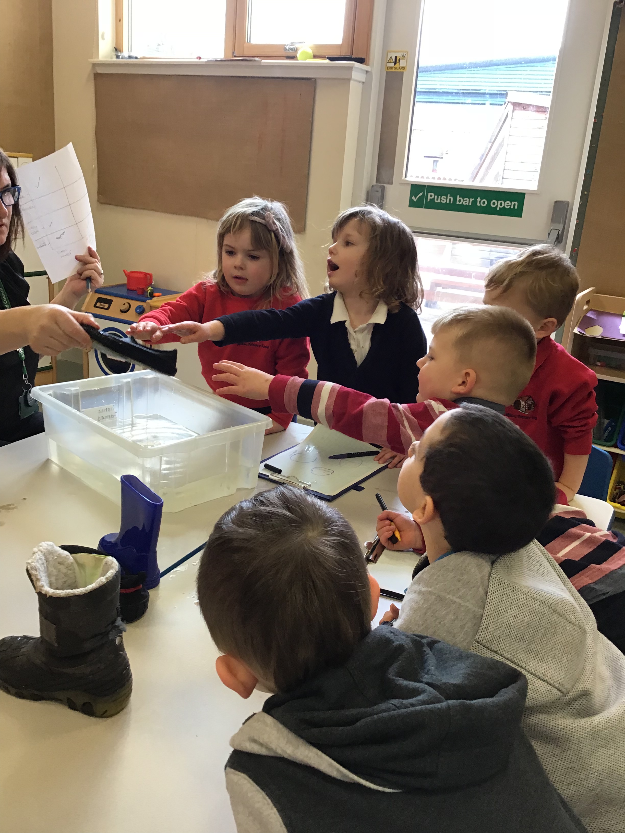 We worked in teams to take notes on our clipboards. First we tried a welly boot in the tub of water. It went into the water and it stayed dry inside, this meant it liked water. Next we tried a trainer, it went into the water and got soaked right through, it did not like the water!
