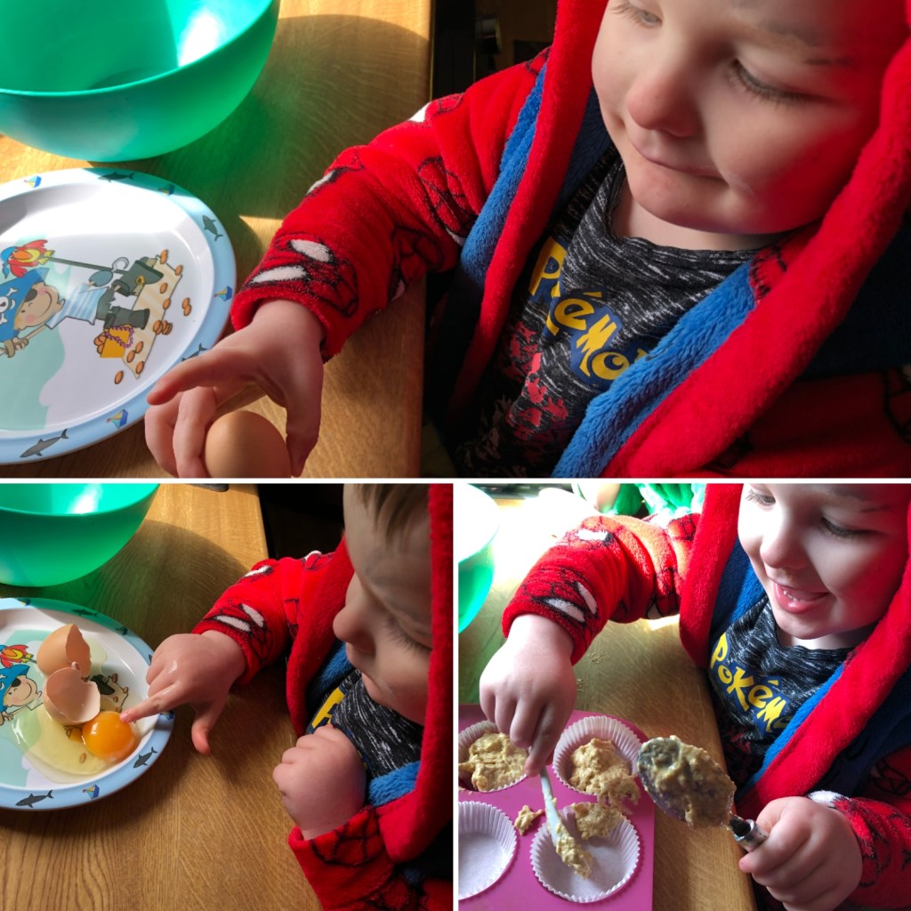 Zachary loved learning about eggs, he explored it both in the shell and cracked open. He didn’t want to waste it so used it to make cupcakes, they look delicious Zachary š