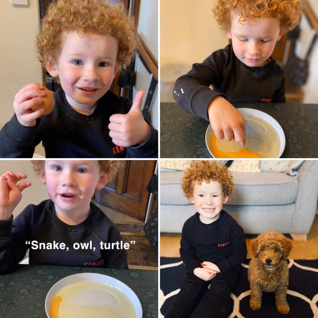 When he held the egg he said it felt good, smooth and cold. Then he cracked it open and pointed to the yolk. He knew that snakes, owls and turtles also come from eggs. Well done Leo.