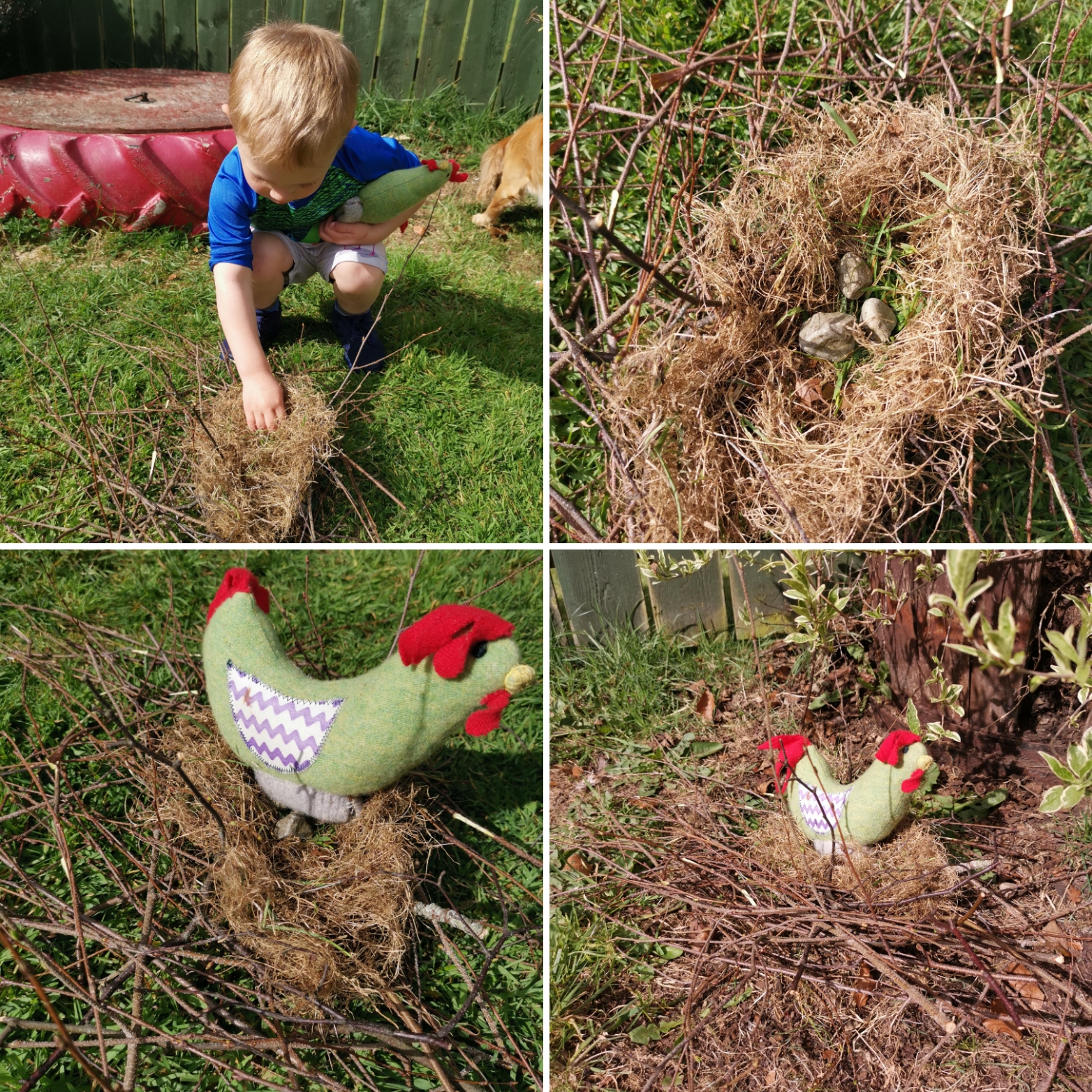 Harris made a nest for his chicken. This is what Harris had to say about it, “Sticks to hold him up off the floor, moss and grass to keep him comfy” then “we should hide him from foxes so he’s not eaten!”