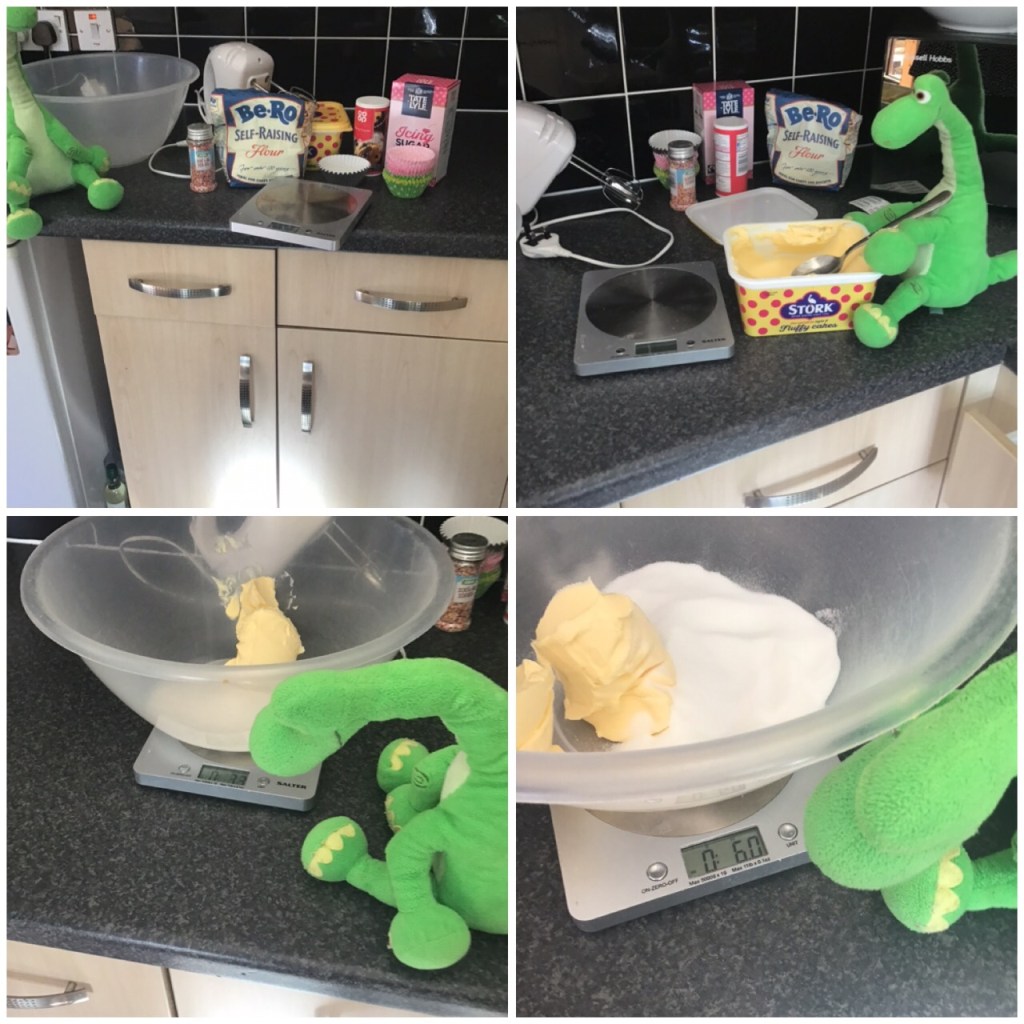 Firstly we will need to carefully weigh out all of our ingredients we will need 6oz margarine, 6oz caster sugar, 6oz self-raising flour, 1 teaspoon baking powder, 3 eggs, and a splash of milk. Lots of counting here.
