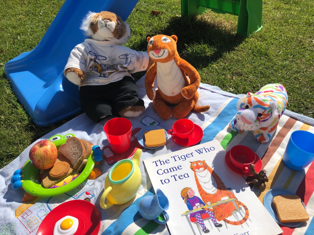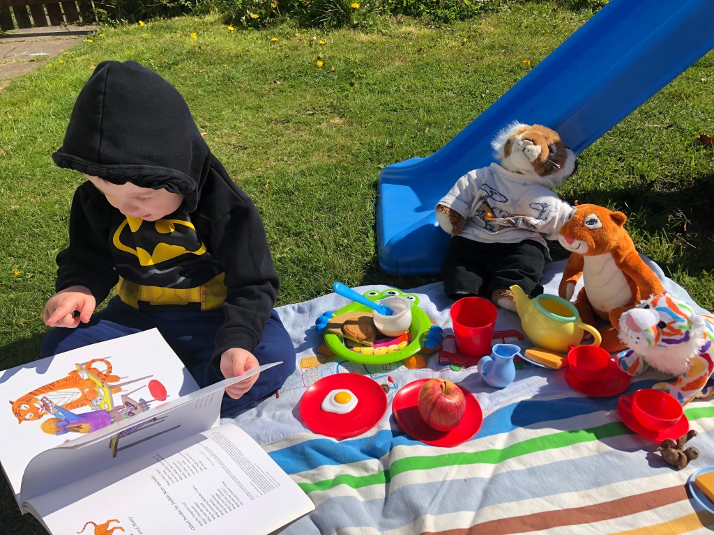 On Friday Zachary was working hard preparing a tea party for his special friend the teddies, the food looks very yummy. Zachary then read to his teddies the story The Tiger Who Came to Tea, all the teddies looked happy out in the sunny garden listening to Zachary re-tell the story. good job Zachary.