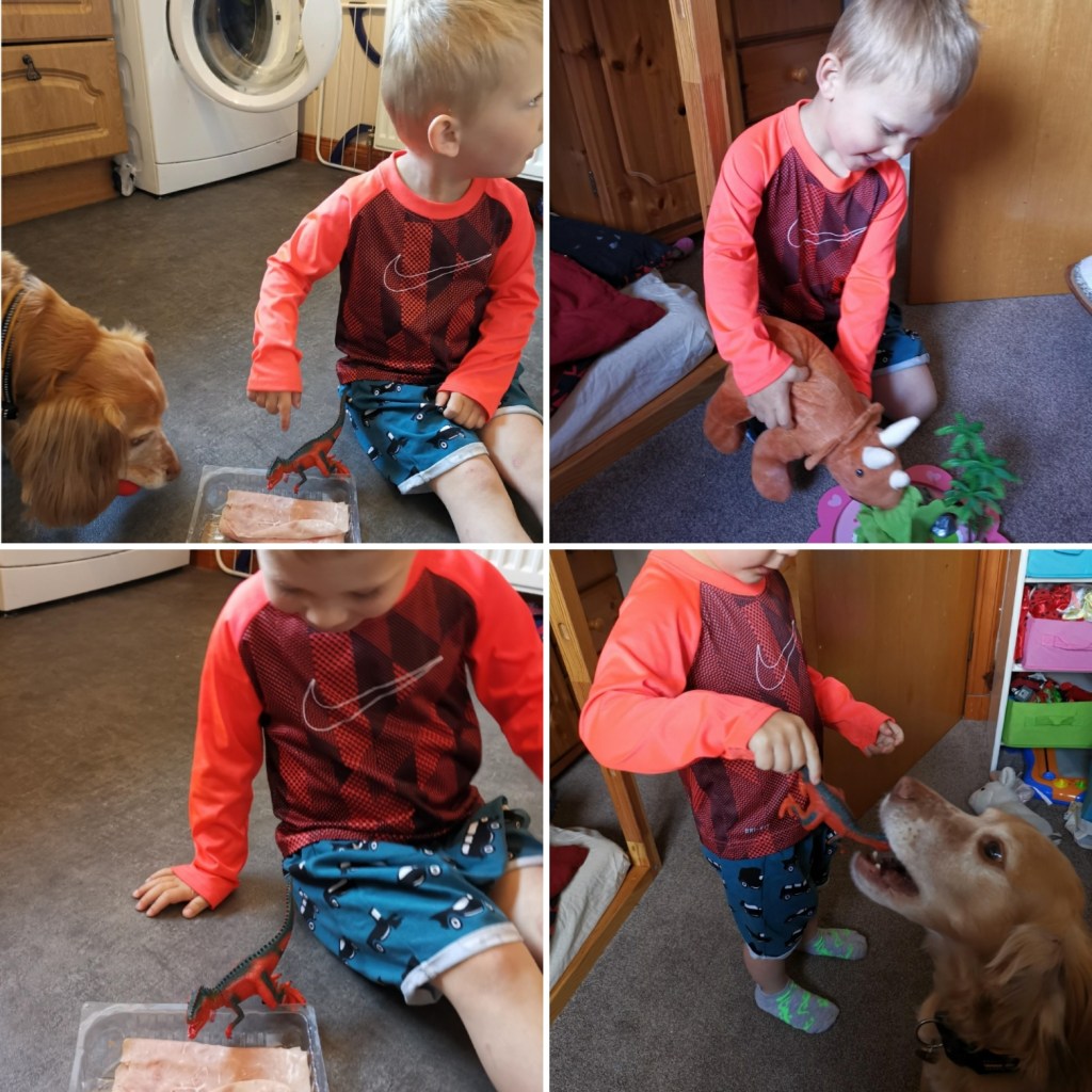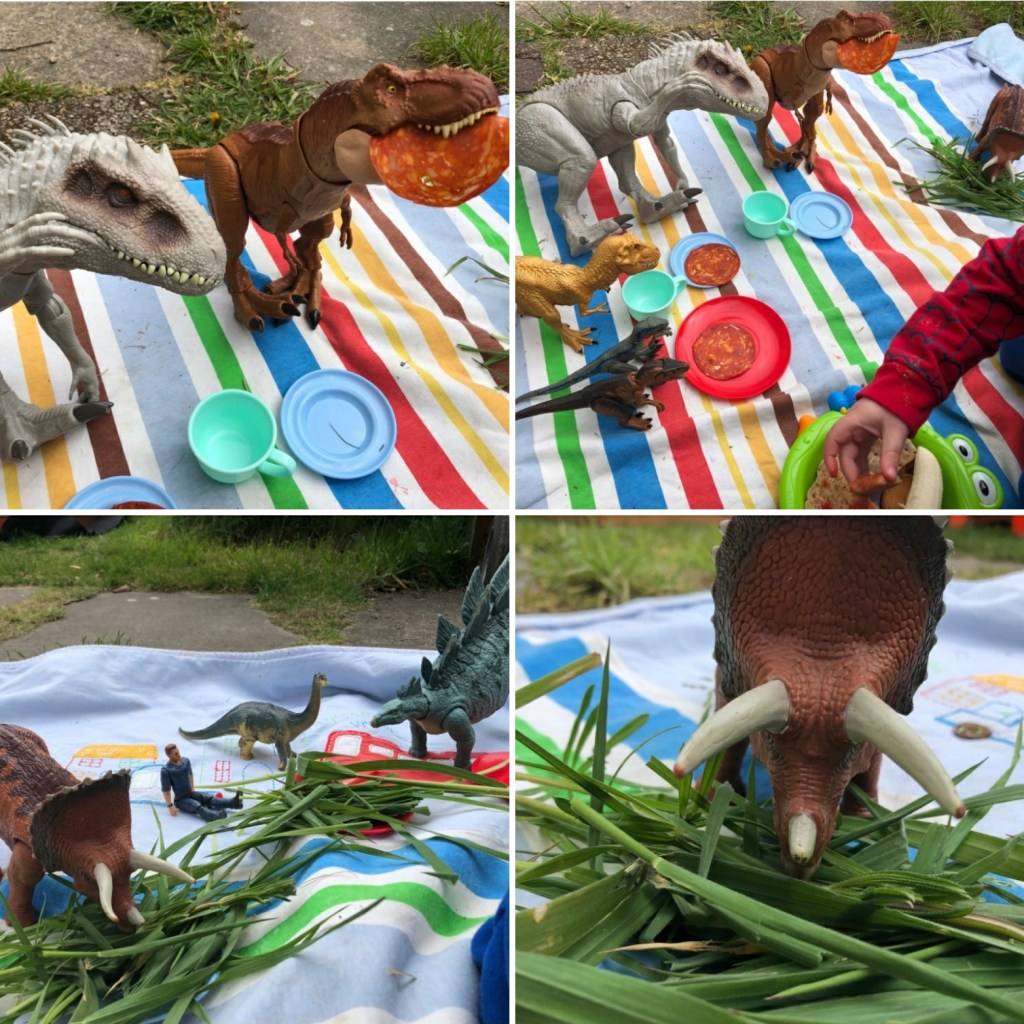 Zachary has had a lot of fun today learning about dinosaurs. He fed his carnivorou dinosaurs some Spam and slices of chorizo. His herbivore dinosaurs had some tasty grass and leaves.