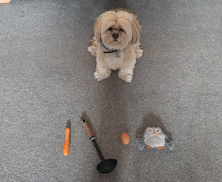 Miss Robinson got her dog involved to show you an example. She found a Carrot, a Ladle, an Egg and an Owl. If you put the first sounds of all those objects together you get her name. Cleo. (She even posed for a picture below!)