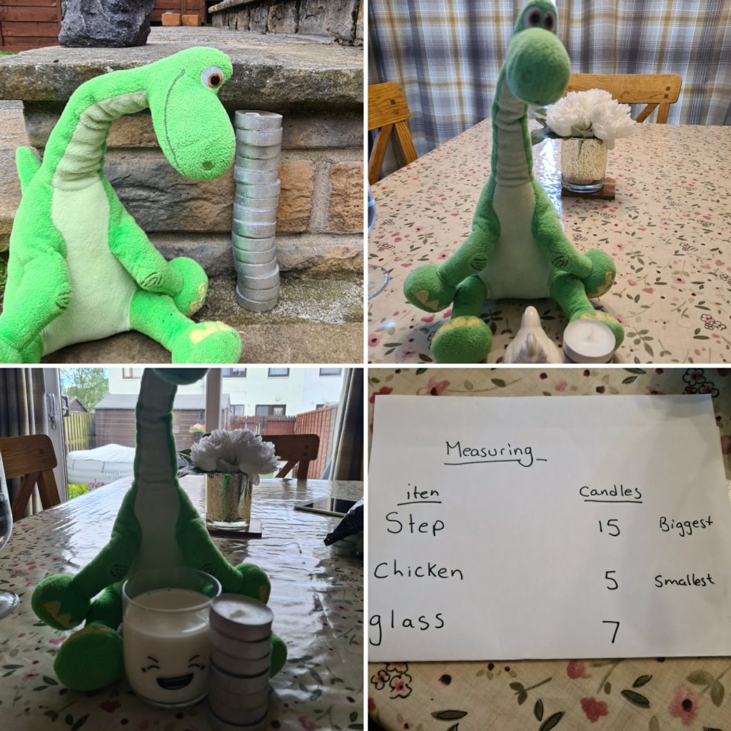 Once you have done the step challenge I have one more activity for you. I would like you to find something around the house to measure the height of your step. It can be anything like Lego, wooden blocks, rubbers, biscuits, even your fingers. We used tealight candles to measure our steps. My step measured 15 tealight candles high. I then went inside and measured two more things. I noted them down and then with some help Mrs Forth explained the one with the most cadles was biggest and the one with the least candles was the smallest. Can you try measuring some more things and let me know what was the biggest and smallest. It would be great if you could send me a photo of your measuring. My email is emma.forth79@gmail.com