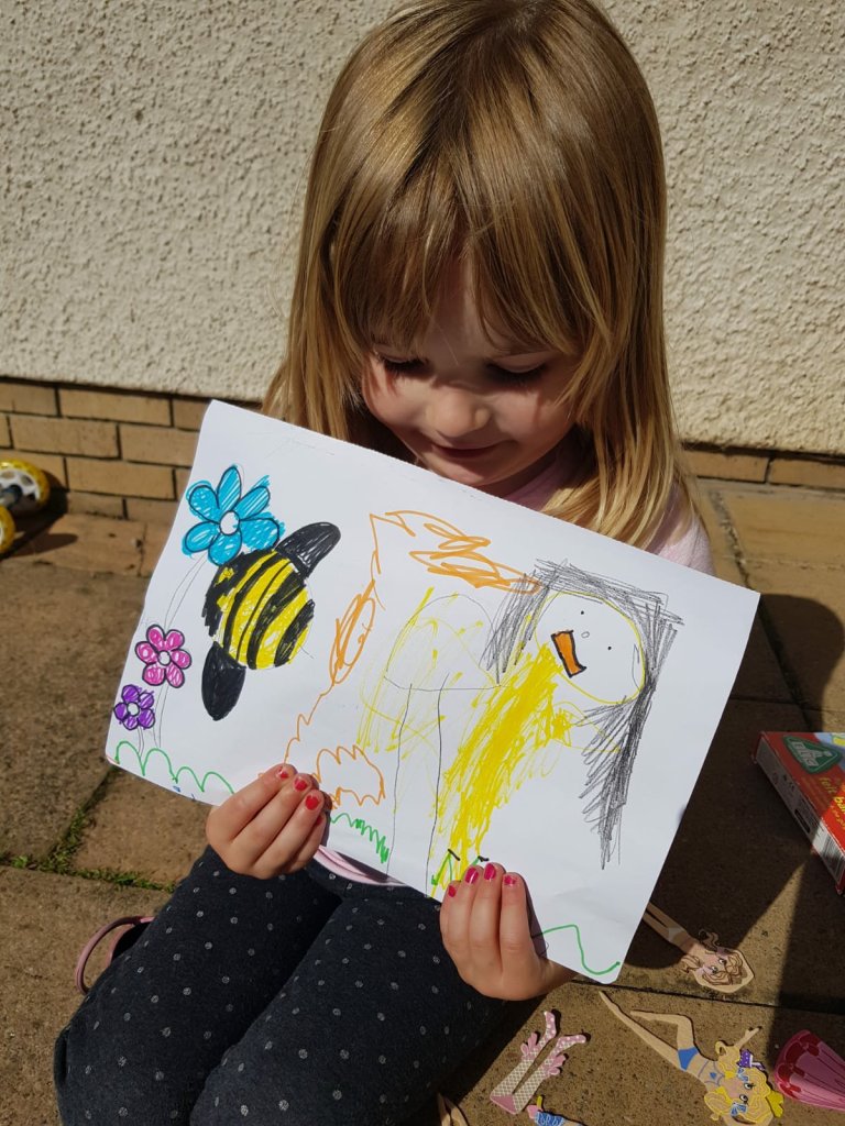 Amy loved seeing Haggis with a bumble bee and she was able to tell me it was looking for pollen. Amy knew this because she saw one in her Granny’s garden. She then drew a beautiful picture of a bee getting pollen from a flower. It’s a super picture Amy.