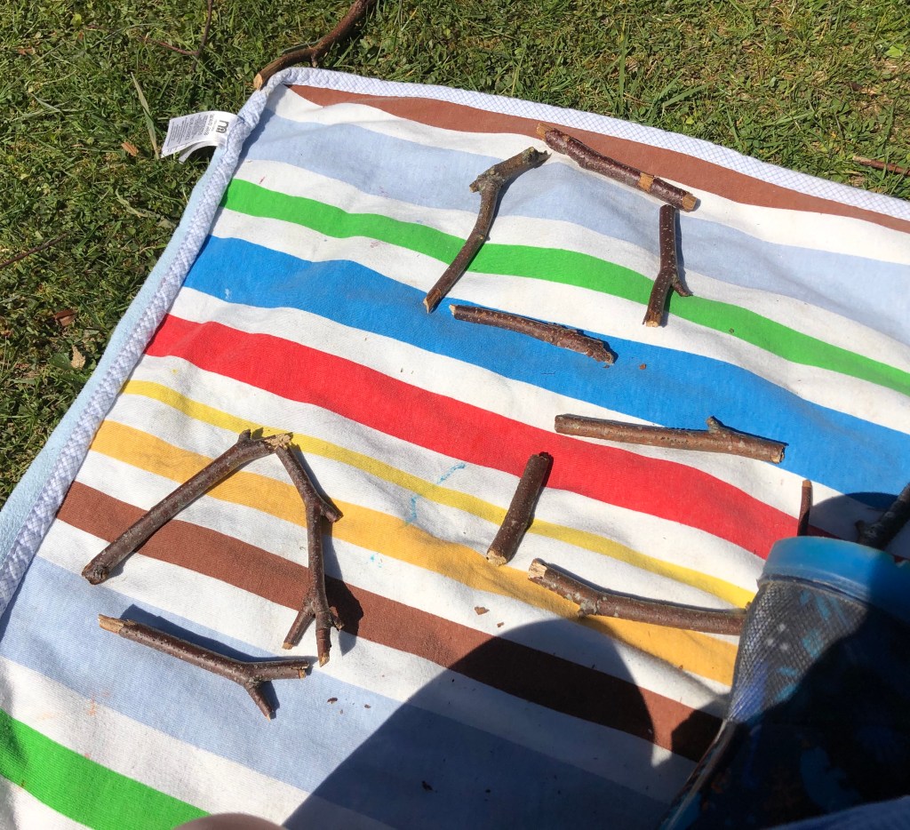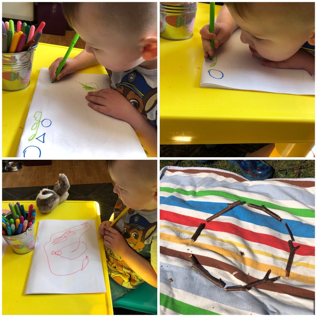 Zachary was working hard in the sun wonderful concentration Zachary lovely pencil control and look at those amazing shapes. I really liked the fact that you looked around the garden and used some sticks to make shapes excellent adaptation of materials good thinking they look so good. Did you count the sticks in each shape?