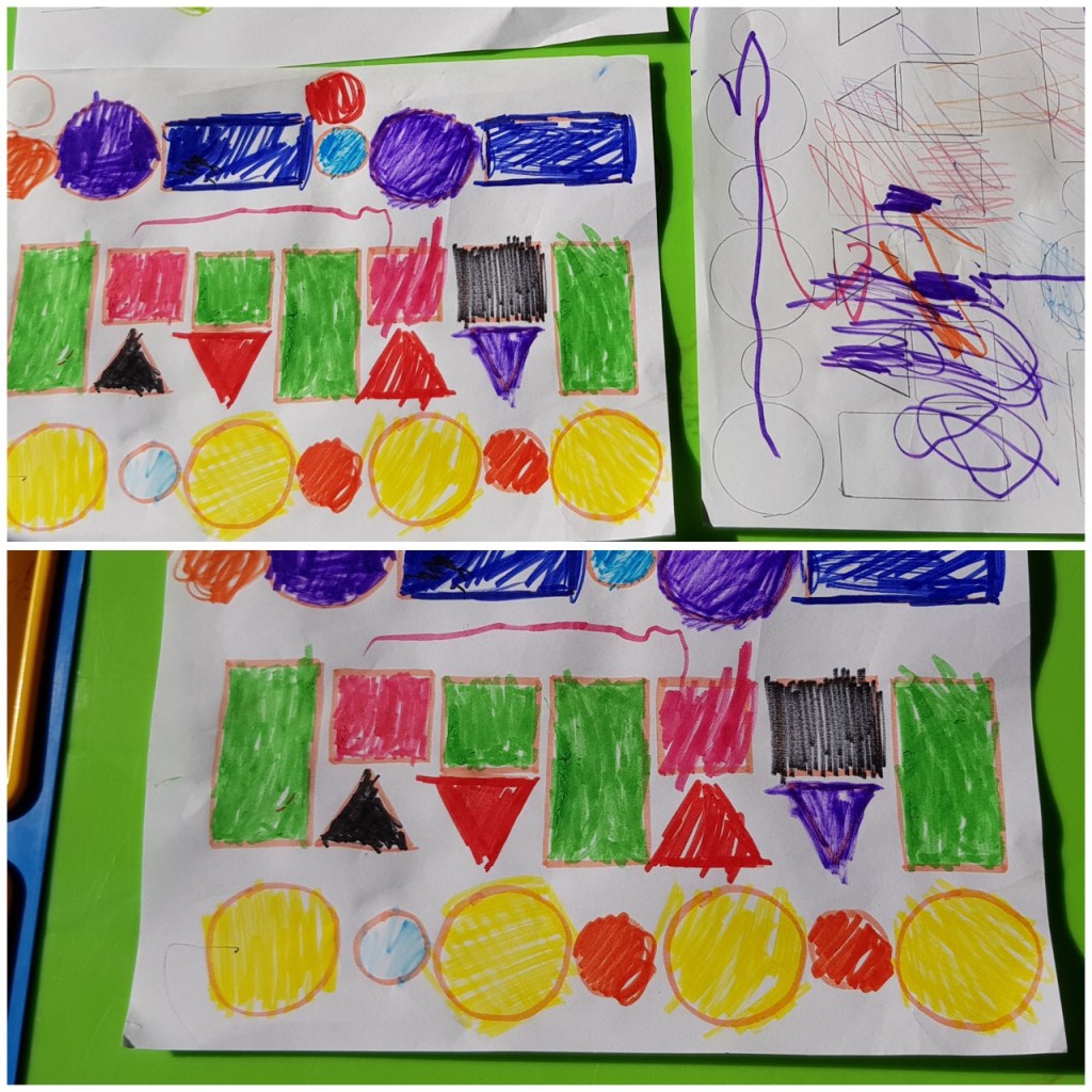 Amy and her sister Zoe were also very busy bees drawing shapes some really wonderful shapes here Amy well done. some good pattern work too Amy, well done to Zoe who tried really hard.