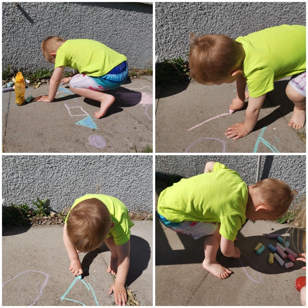 Harris looked as if he was having a great time out in his shorts and t-shirt, Harris used the same as haggis using some colourful chalks to make his shapes. These are fantastic shapes Harris well done.
