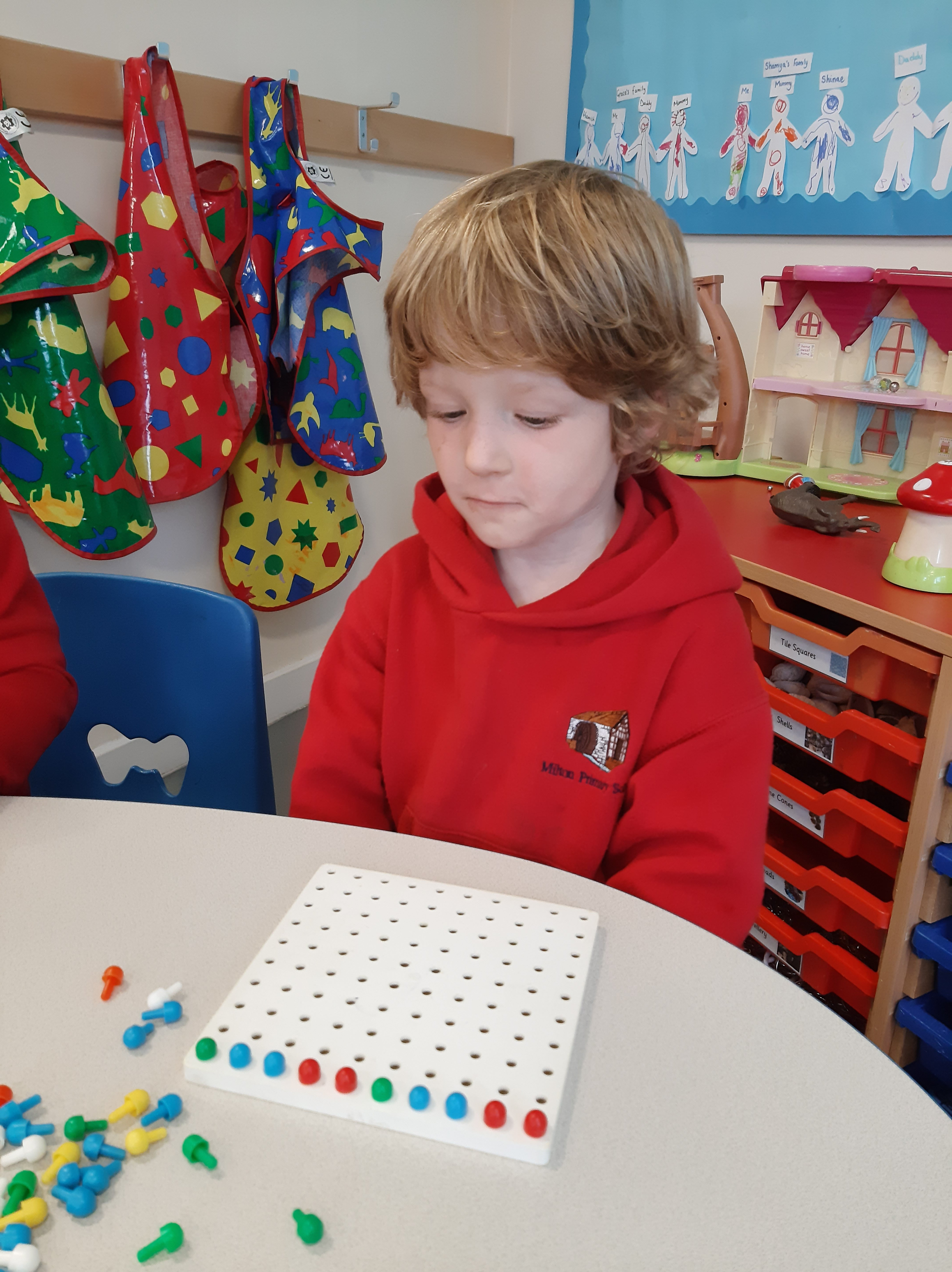 Today the boys and girls in Primary 1 (or the Seahorses as we have renamed ourselves!) were busy exploring pattern. The children had lots of fun using peg boards to explore making their own patterns as well as trying to copy some patterns that Miss Robinson made. The children all worked really well and Miss Robinson was really impressed by how much they all concentrated on the task.