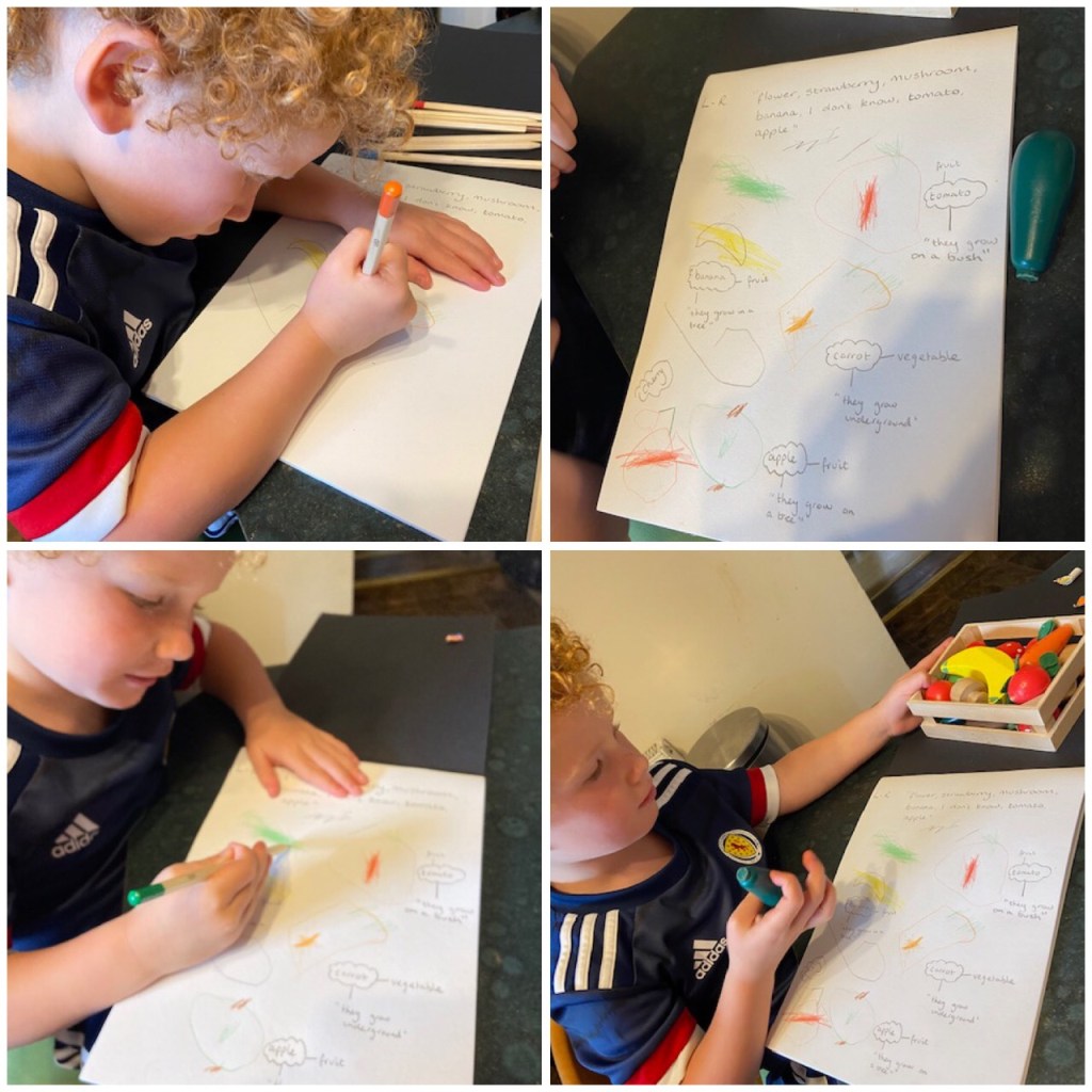 Today Leo was busy with his lovely crayons drawing his fruit and vegetables he used his sisters Ali and Anna fruit from their toy kitchen. Good thinking Leo great work ⭐️⭐️
